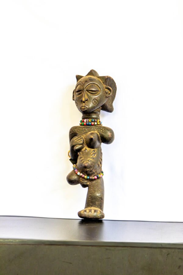A unique wooden figure depicting a woman with one leg covering one breast, made with wood & colorful beads by the Hemba people of Southeast Congo, representing a particular ancestor to be venerated in village shrines, circa 1950s-60s.